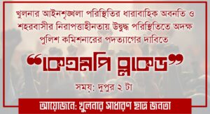 খুলনার আইনশৃঙ্খলা পরিস্থিতির ধারাবাহিক অবনতি ও শহরবাসীর নিরাপত্তাহীনতায় উদ্বুদ্ধ পরিস্থিতিতে অদক্ষ পুলিশ কমিশনারের পদত্যাগের দাবিতে❝কেএমপি